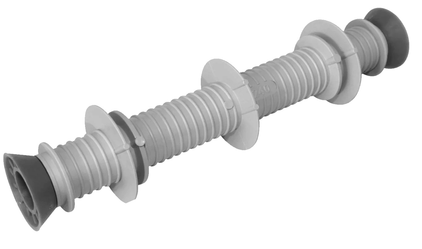 Fertig montierter Kunststoff-Schalungsabstandhalter, bestehend aus rauem Rundrohr 22/26 und Konen 22. Wasserdichtheit geprüft.
